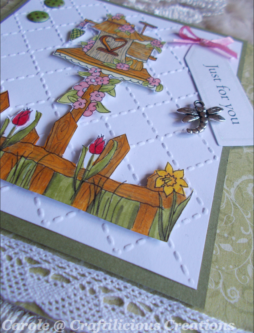 The images are from Polkadoodles. The birdhouse is Beautiful Birdhouse 4 and the fence is a free digi from the Tatty Twinkle Easter bundle. They were coloured with Spectrum Noir markers and fussy cut. They were attached with foam pads to a piece of white card which had been dry embossed with an Xcut Quilt folder. This was matted on to green card and attached with foam pads to the design paper from a pad called Spring in Bloom by Trim Craft.