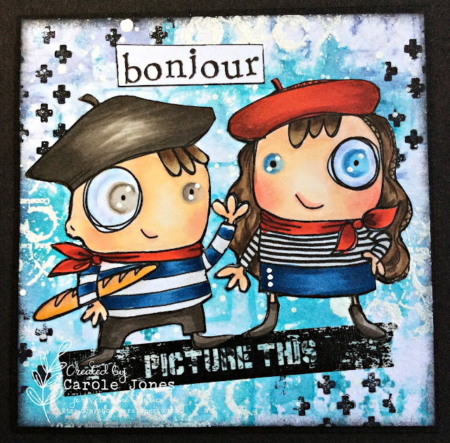 I used the French Holiday digi set. The background was stamped with a stencil drenched in Oxide inks. Stamping and heat embossing were added and word washi tape for grounding.